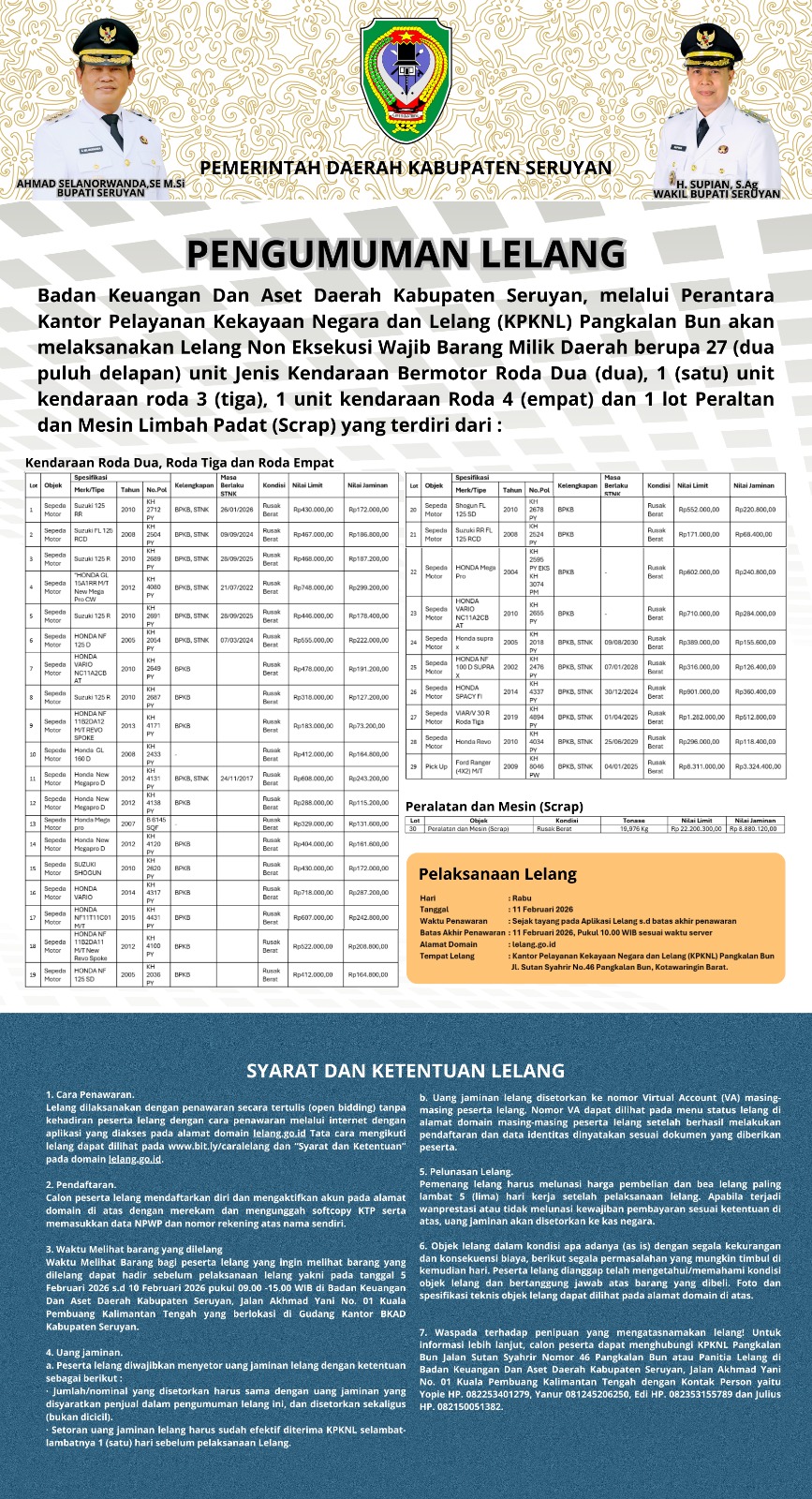 Beranda Advetorial Pengumuman Lelang Pemerintah Daerah Kabupaten Seruyan Pengumuman Lelang Pemerintah Daerah Kabupaten SeruyanEditor - Advetorial7 Februari 2026BagikanREAD Tanggapan Pemda terhadap Rekomendasi LPKJ DPRDBagikanBaca JugaGencarkan Sosialisasi Ops Keselamatan Telabang 2026, Satlantas Polres Seruyan Bagikan Brosur ke PengendaraPemilu OSIS Sebagai Pembelajaran Demokrasi yang Berintegritas dan Membentuk Jiwa KepemimpinanBupati Seruyan Meriahkan Perayaan Natal Gabungan ASN dan TNI-PolriMaria Priscilla Meriahkan Ibadah Natal Gabungan ASN dan TNI-Polri Seruyan661 PPPK Paruh Waktu Naungan Disdik Seruyan Bangga Setelah Penempatan Disesuaikan KebutuhanKapolres Seruyan Ngopi Bersama Pekerja Media, Perkaut Sinergi dan Keterbukaan InformasiBakti Amal Khitan Masjid Al Hidayah Periode ke-8 Berjalan SuksesLayanan USG 4 Dimensi (4D) Hadir di UPT RSUD Kuala PembuangMasalah Perekonomian Bisa Menjadi Pemicu Gangguan KejiwaanMasyarakat Dikenalkan Faktor Penyebab Kanker ParuIGD UPT RSUD Kuala Pembuang Siap Melayani 24 JamSarana Rawat Inap UPT RSUD Kuala Pembuang Tersedia 105 Tempat TidurBerita TerkaitGencarkan Sosialisasi Ops Keselamatan Telabang 2026, Satlantas Polres Seruyan Bagikan Brosur ke PengendaraPemilu OSIS Sebagai Pembelajaran Demokrasi yang Berintegritas dan Membentuk Jiwa KepemimpinanBupati Seruyan Meriahkan Perayaan Natal Gabungan ASN dan TNI-PolriMaria Priscilla Meriahkan Ibadah Natal Gabungan ASN dan TNI-Polri Seruyan661 PPPK Paruh Waktu Naungan Disdik Seruyan Bangga Setelah Penempatan Disesuaikan KebutuhanKapolres Seruyan Ngopi Bersama Pekerja Media, Perkaut Sinergi dan Keterbukaan InformasiBakti Amal Khitan Masjid Al Hidayah Periode ke-8 Berjalan SuksesLayanan USG 4 Dimensi (4D) Hadir di UPT RSUD Kuala PembuangMasalah Perekonomian Bisa Menjadi Pemicu Gangguan KejiwaanMasyarakat Dikenalkan Faktor Penyebab Kanker ParuRekomendasi untuk kamuGencarkan Sosialisasi Ops Keselamatan Telabang 2026, Satlantas Polres Seruyan Bagikan Brosur ke PengendaraPemilu OSIS Sebagai Pembelajaran Demokrasi yang Berintegritas dan Membentuk Jiwa KepemimpinanBupati Seruyan Meriahkan Perayaan Natal Gabungan ASN dan TNI-PolriMaria Priscilla Meriahkan Ibadah Natal Gabungan ASN dan TNI-Polri Seruyan
